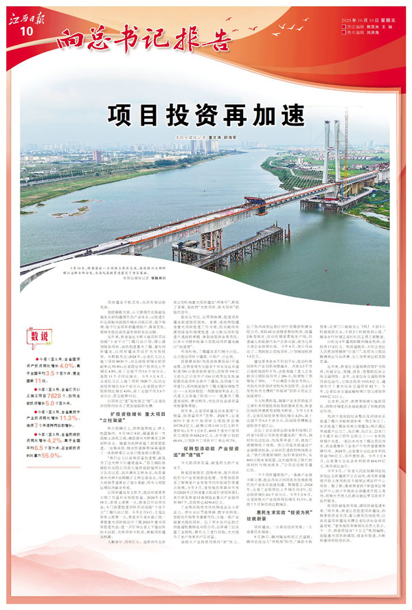 近年来,我省坚定不移实施项目带动战略“十百千万”工程行动计划,精心谋划储备项目,加快推进重大工程、重大项目建设,以项目建设带动扩大有效投资。有数据为证:2024年,全省亿元以上施工项目8830个,对全部投资增长的贡献率达93.8%;全省固定资产投资比上年增长4.8%,高于全国平均1.6个百分点,连续11个月环比增长。今年1至8月,全省亿元以上施工项目7828个,拉动全部投资增长5.0个百分点;全省固定资产投资同比增长4.0%,高于全国平均3.5个百分点,居全国第11位。