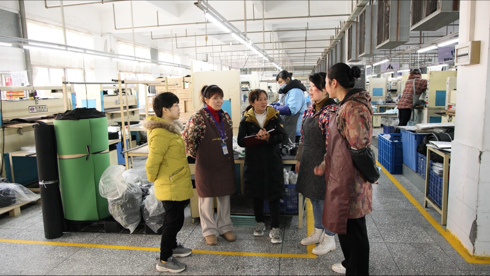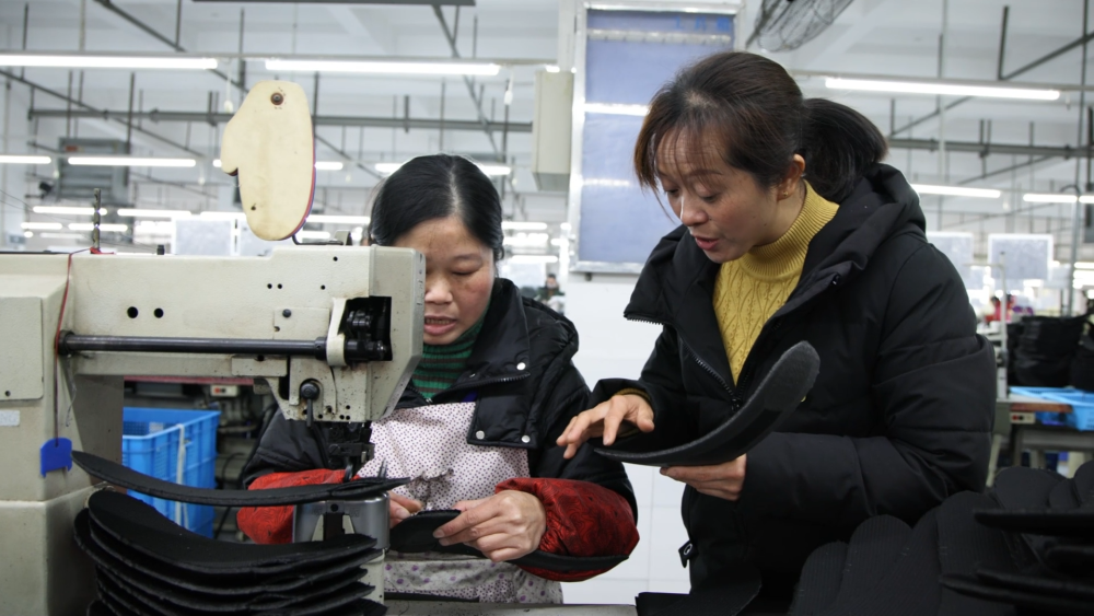 2月28日,赴京参会三天前,心里还记挂着鞋厂,她来到工位前,拿起一只滑雪鞋鞋面,双手用力压住硬挺的材质,叮嘱工友:“这种鞋面更硬,缝的时候双手要压稳,针脚才能匀称。”