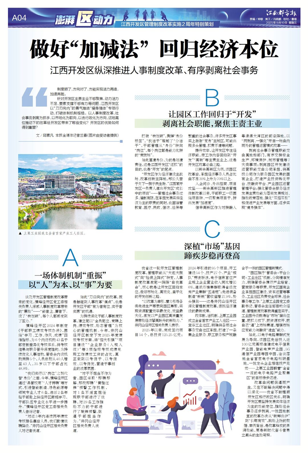 针对开发区主责主业不够聚焦、动力活力不足、要素支撑不够有力等问题,江西开发区以“刀刃向内”的勇气推进“瘦身强体”专项行动,打破体制机制桎梏。以人事制度改革、社会事务剥离为抓手,以市场化为取向,以去行政化为方向,这场高位推动下的改革给开发区带来了哪些变化?开发区的优势如何得到重塑?
