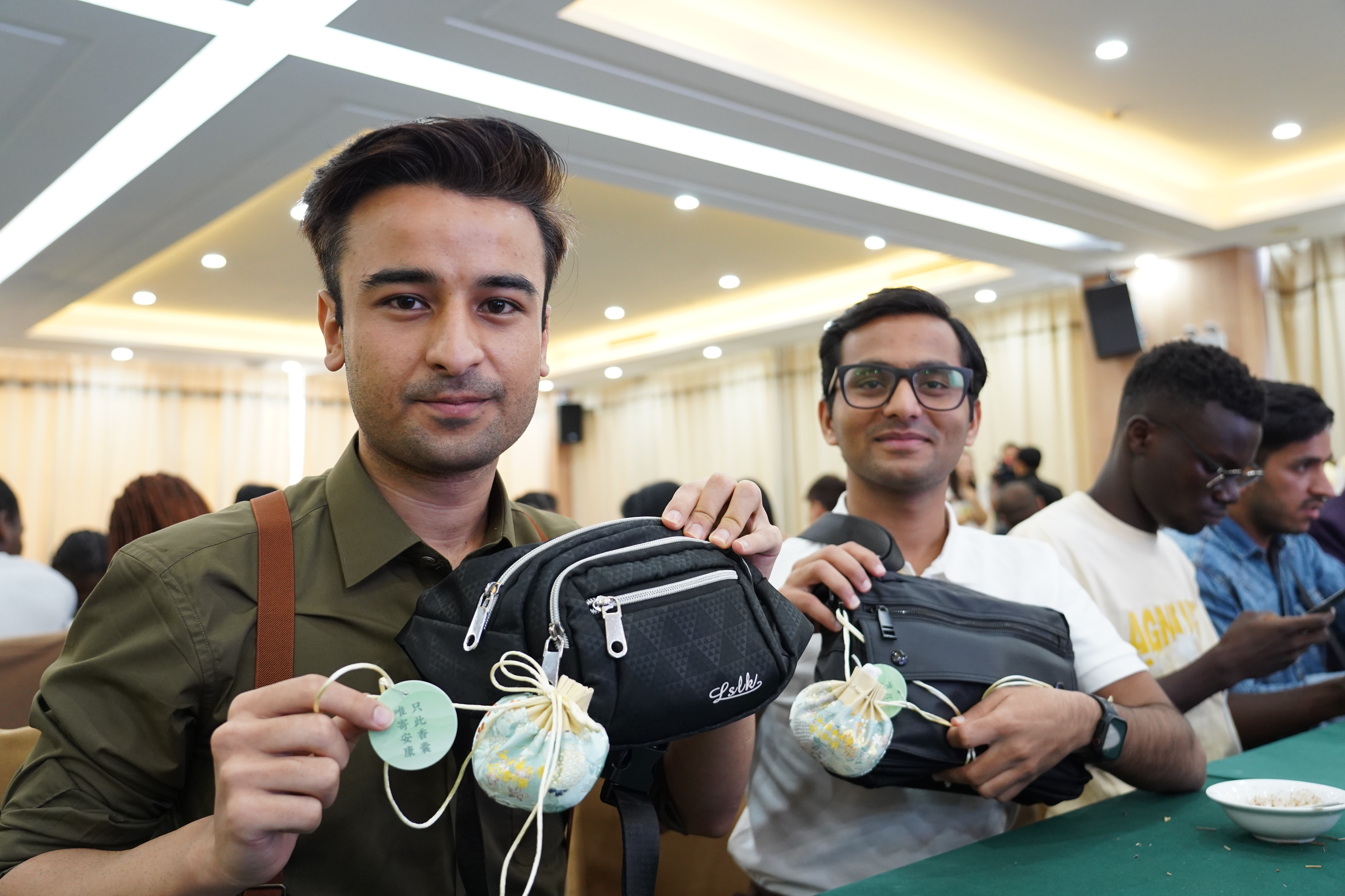 ▲外国留学生展示制作好的中药香囊。