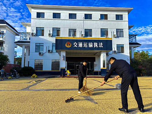 大江新闻讯(通讯员 邹慈顺、郑晓慧)暖阳洒在省交通运输执法局七支队三大队的院子里,白墙蓝檐显得格外利落。然而,院坝并未停满车辆,反而铺满了附近乡亲的稻谷,金黄色的稻子沐浴在阳光中,散发着秋收 的香气。