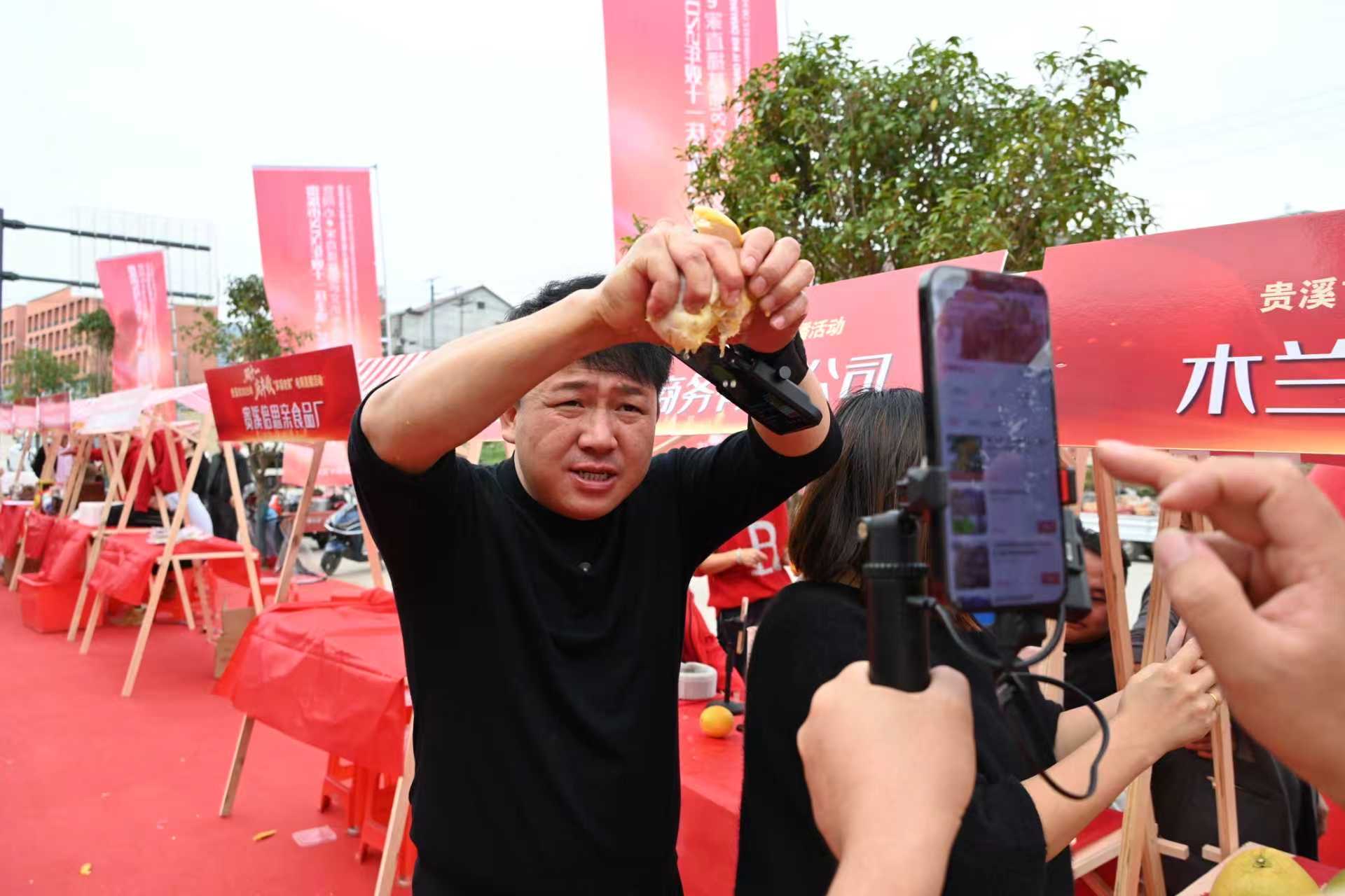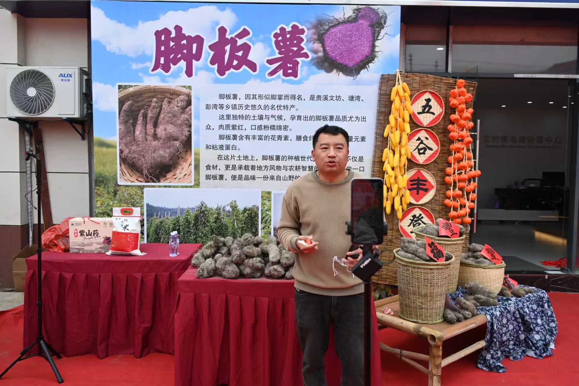 走进活动现场,脚板薯、香柚、脐橙等带着泥土芬芳的农产品整齐陈列,畲族刺绣、手工竹编等特色手工艺品点缀其间。贵溪网络达人大旺哥一边展示产品,一边通过手机与网友互动,直播间里“下单”“上链接”的留言不断刷屏。