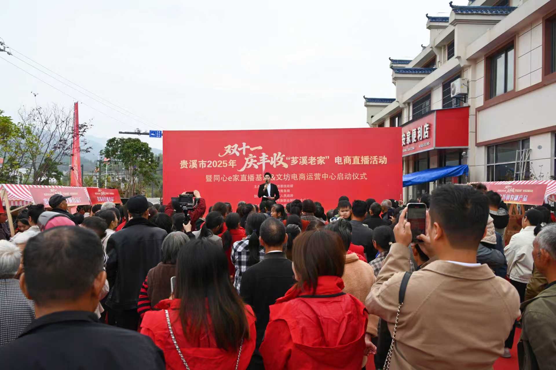 大江新闻讯 胡齐 通讯员徐立书报道:11月11日,贵溪市2025年“双十一·庆丰收”芗溪老家电商直播活动暨同心e家直播基地启动仪式,在该市文坊镇电商运营中心举行。