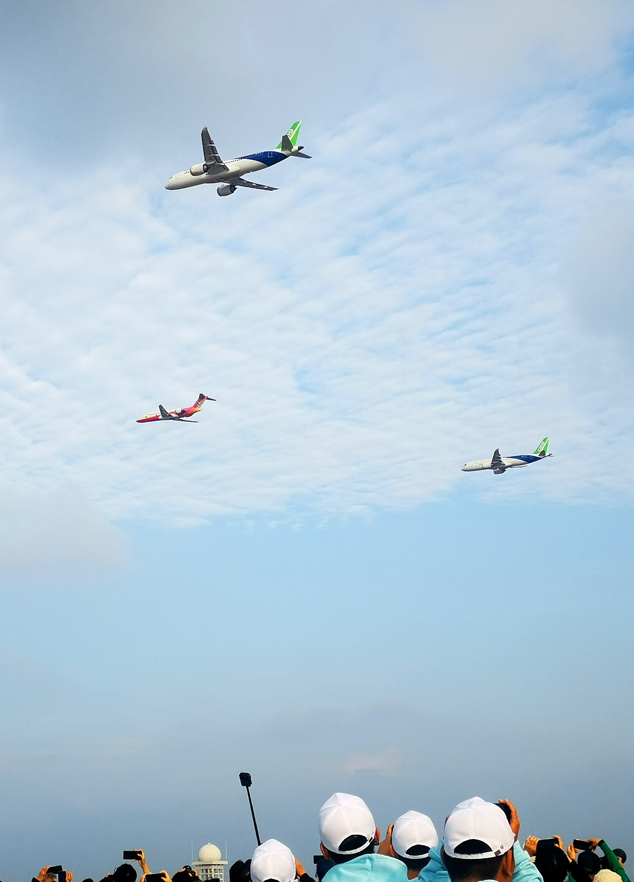 ▲10月31日,南昌飞行大会,国产大型客机C919与支线飞机C909首次三机编队飞行。江西日报全媒体吴志刚摄