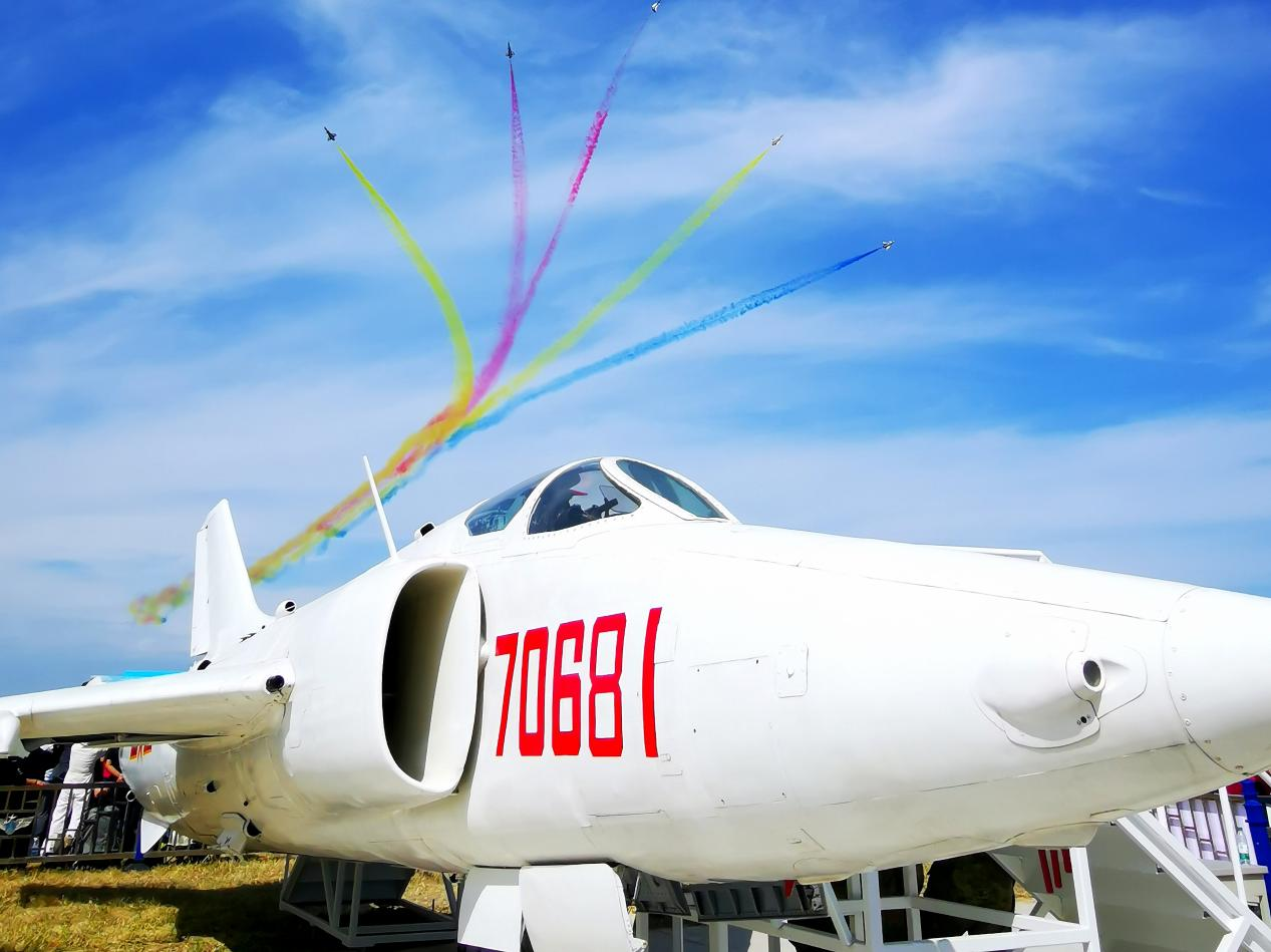 ▲9月20日,长春航空展,八一飞行表演队驾驶国产先进战机歼10飞跃南昌生产的强五战斗机。江西日报全媒体记者吴志刚摄