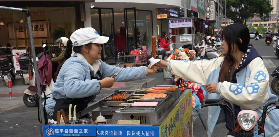 大江新闻讯 江西日报全媒体记者殷琪惠 实习生俞丽薇报道:12月5日,下午三点,信丰县城街头,王琼的烤肠摊前香气四溢。几个月前,她还在为贴补家用发愁;如今,在政府提供的免费摆摊设备支持下,她每天准时出摊,月流水稳定在5000元左右。