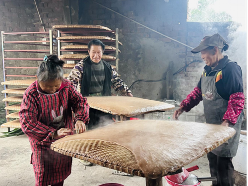 每天天不亮,父女俩就和雇工忙开了:打山泉水拌薯粉浆,直到搅出的粉浆细腻如脂;蒸制靠两口柴火灶,火候全凭经验掌控,6到7分钟差一秒都不行;出锅后,迅速在特制的方形竹簸箕上手工拉皮,再置于阴凉处阴干定型。全程无任何添加剂,只为那一口“煮不烂、不糊汤、嚼着有薯香”的地道风味。