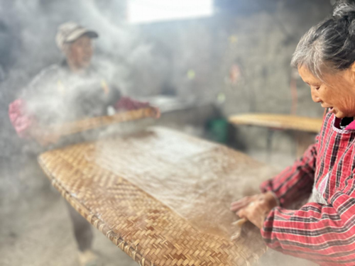 五年前,在外务工的女儿听说了父亲的顾虑,毅然回村:“爸,我跟着你学,咱家这手艺不能丢。”从一开始分不清火候老嫩,到现在能独立拌浆、烹蒸、拉皮、切割,女儿手上磨出了和父亲一样的老茧,也慢慢懂了“做吃的要对得起良心”的道理。她还帮着作坊登记台账理清收支,偶尔拍些加工的小视频发在亲友群里,老作坊也添了点新气儿。