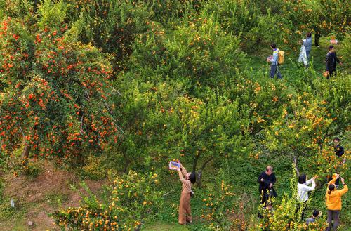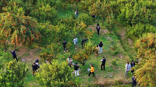 近日,南丰县琴城镇的一处蜜橘种植基地,游客在采摘南丰蜜橘。近年来,该县大力实施蜜橘品质提升工程,在良种繁育、标准橘园建设、病虫害绿色防控、水肥一体化等方面进行标准化生产管理,全力推动蜜橘高品质、绿色化发展。特约通讯员 朱海鹏摄