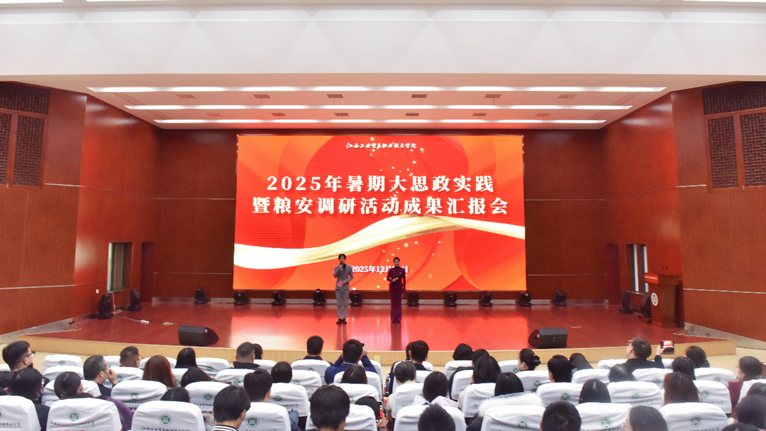 大江新闻讯(通讯员陶欣桐、吴凌浩)12月24日,江西工业贸易职业技术学院2025年暑期大思政实践暨粮安调研活动成果汇报会在图书馆学术报告厅举行。学院党委书记万晓波,党委副书记、院长朱迎强,党委委员、纪委书记何锐,党委委员、副院长曾聪,校史编撰顾问赵淑华,党委委员党委宣传部部长谢继勇,院长助理、院办主任王佳等出席会议,相关部门负责人、思政课教师、专职辅导员及学生代表等400余人参加,共同见证暑期实践与粮安调研的丰硕成果。
