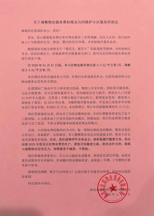 南昌市青山湖区达观国际小区的业主就有这样的感受。2025年12月31日,该小区物业公司,南昌达观物业服务有限公司发布通知,明确从2026年1月1日起,高层住宅物业服务费由2.5元/㎡下调至2.4元/㎡。同样是1毛钱的降幅,这则通知一出,业主们纷纷吐槽:这样的降价实在“微不足道”,难以体现物业的服务诚意。