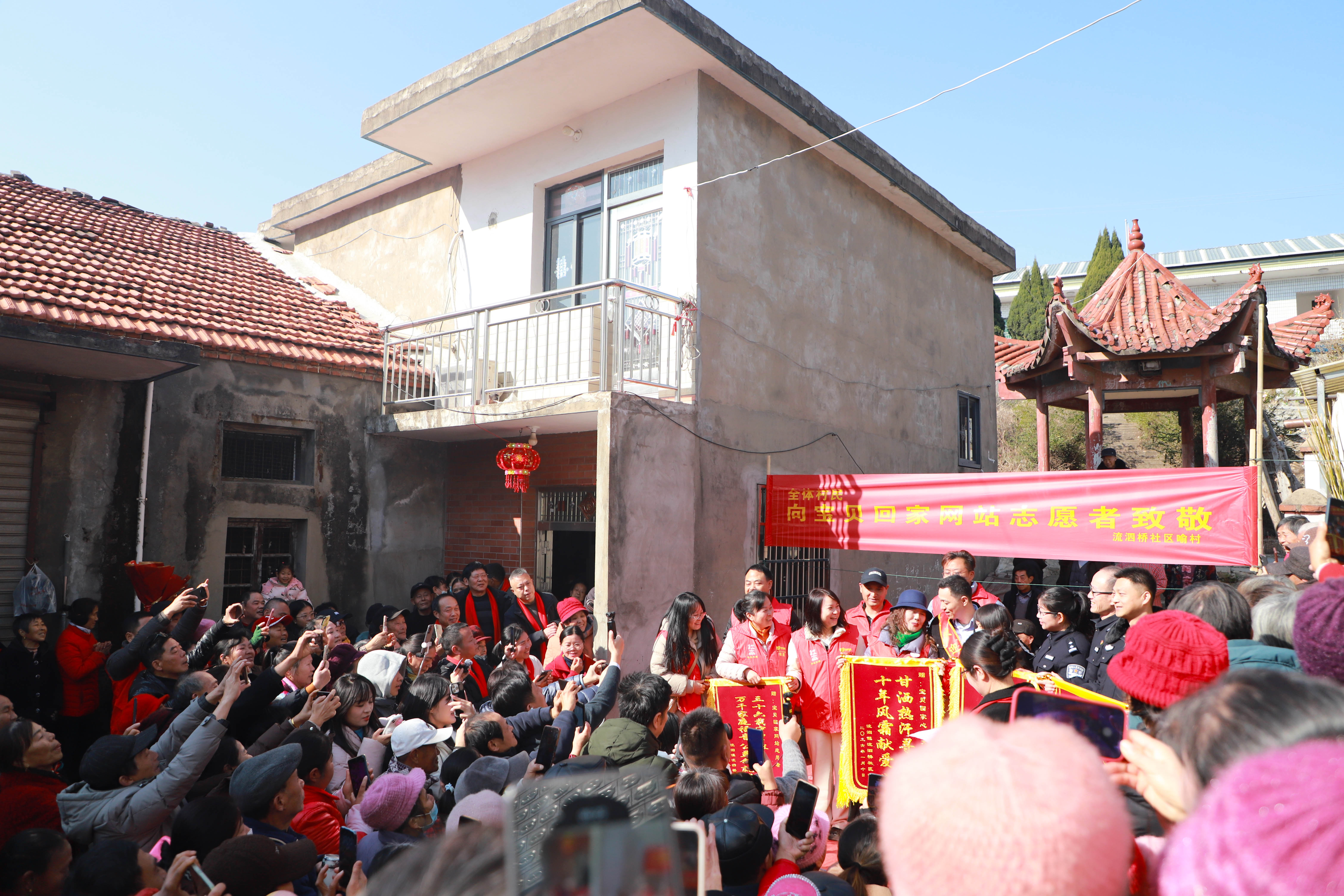 1月10日上午,在湖口县流泗镇喻家湾,闻讯赶来的乡亲们早已拉起了欢迎的横幅。沈海斌 摄