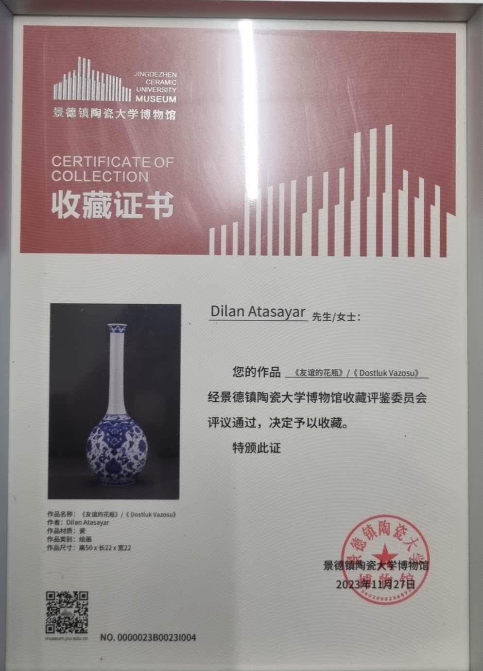 《友谊的花瓶》最终被景德镇陶瓷大学博物馆收藏。说起这事,眼里闪着欣喜的迪兰,给记者找出了当时博物馆颁给她的收藏证书。“能被母校的博物馆收藏,我感觉很开心,我的技艺和创作理念得到了别人的认可!”