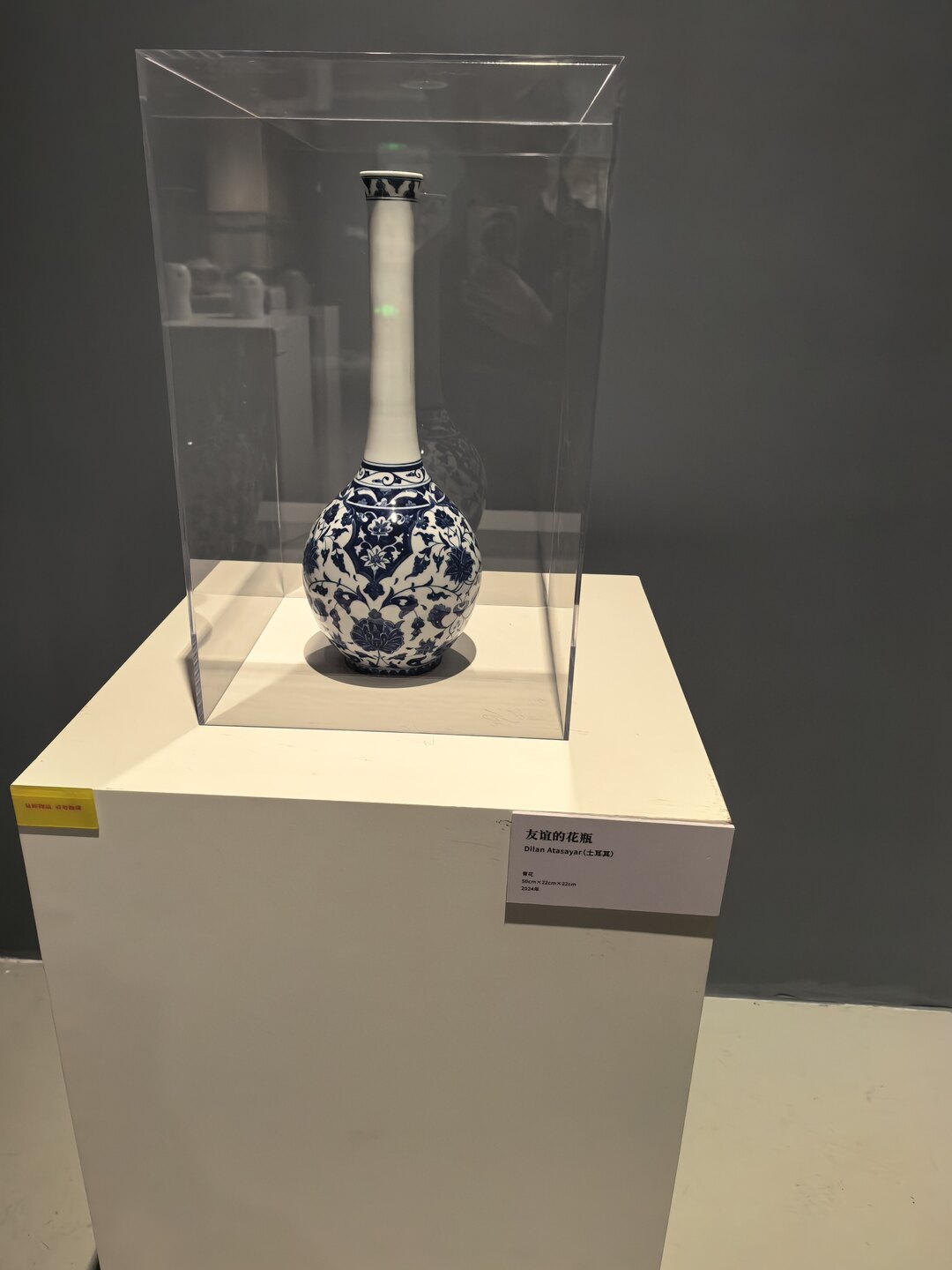 本次特展展出的《友谊的花瓶》,正是迪兰学术思考与艺术探索的凝结。这一创作选择与展览的丝路、瓷色主题深度共鸣。“敦煌在历史上与丝绸之路密不可分,而青花瓷正是丝路沿线文化交流中最具代表性的艺术形式之一。”迪兰阐释道,青花瓷的审美与技艺曾随丝路商旅远播,成为不同文明对话的视觉语言。
