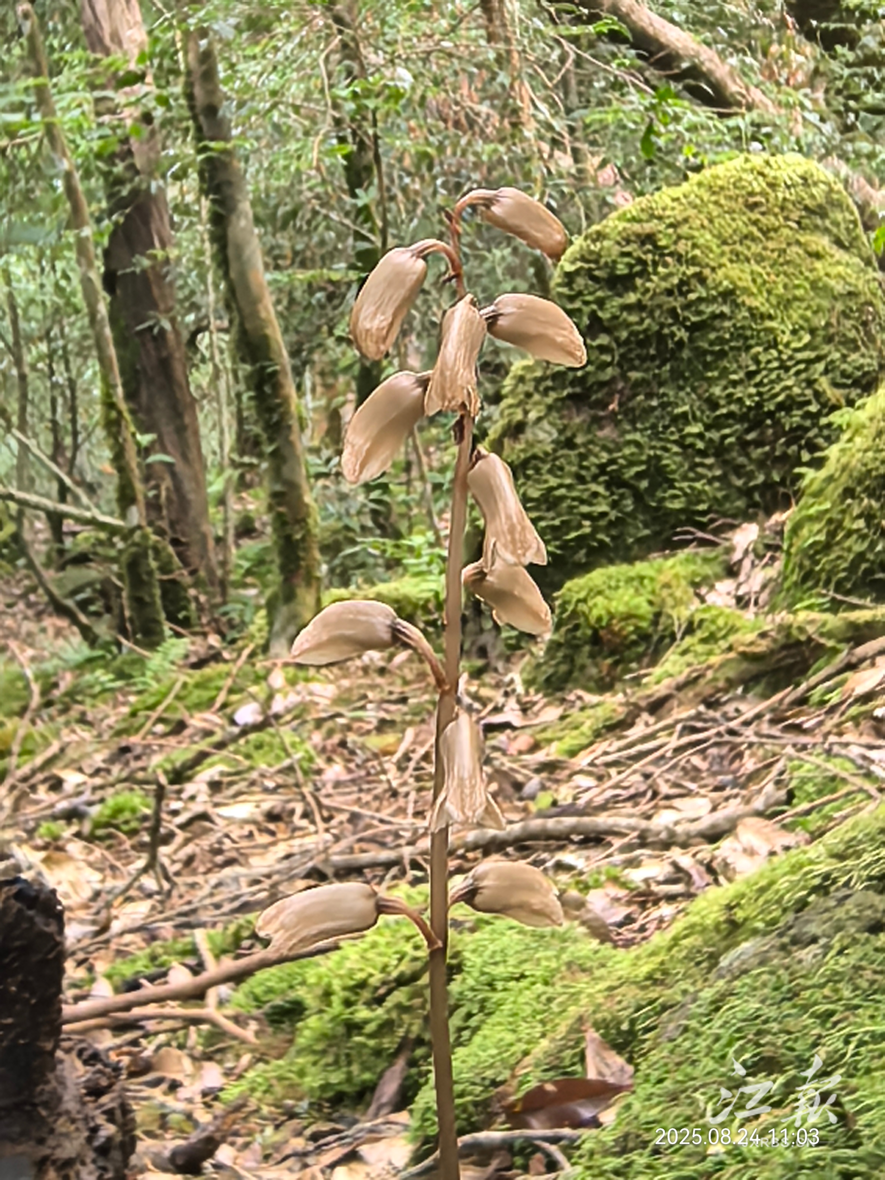 兰科植物对生长环境要求极为苛刻,有的腐生类物种一生无叶,且部分兰科物种花期短暂,给野外发现与记录工作带来极大难度。为摸清这些“植物精灵”的生存轨迹,科研团队自2025年4月起,先后13次深入黄岗山、过风坳、独竖尖等核心区域,足迹遍布海拔400至2100米的沟谷密林、苔藓岩缝,克服山区气候多变、道路湿滑等一系列野外风险,成功探明了片区内兰科植物的生存状况。