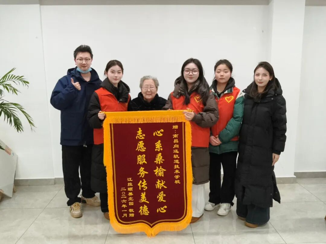 大江新闻讯 近日,江投颐养北园相关负责人专程将一面镌刻着“心系桑榆献爱心 志愿服务传美德”的锦旗赠予南昌向远轨道技术学校,以此感谢学校“轨道先锋志愿服务队”长期以来的暖心志愿服务,这也是校社携手践行尊老敬老传统美德的生动体现,更是学校党建品牌“向心圆”引领志愿服务走深走实的有力见证。