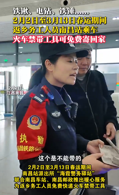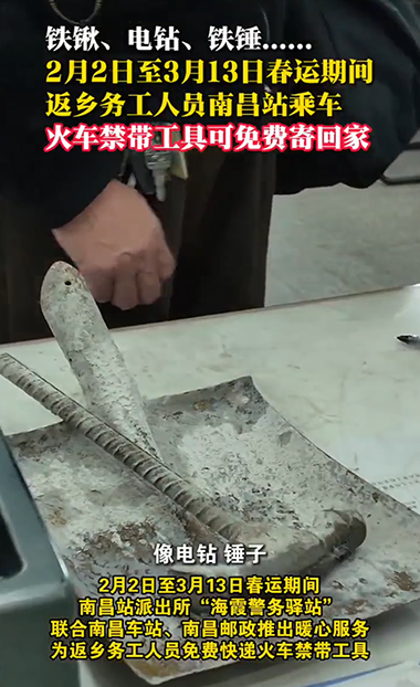 春运潮涌,归心似箭。近日,一段关于南昌火车站在春运期间免费为返乡务工人员邮寄铁锹、电钻等火车禁带限带工具的短视频引发关注,网友们纷纷留言称赞“做法很暖心”“管理人性化”。