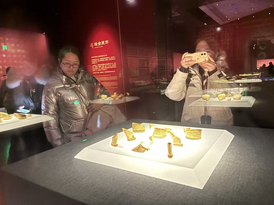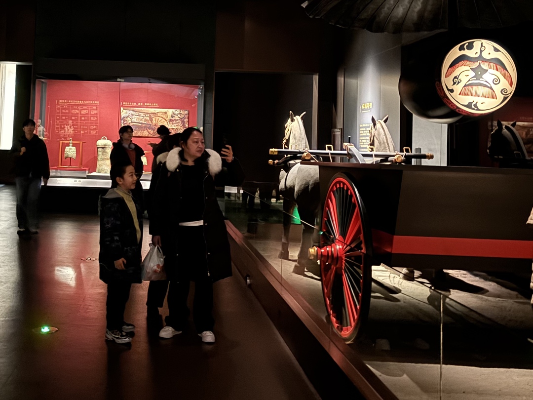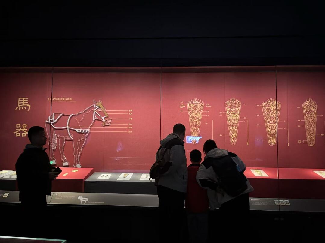 来自贵州贵阳的赵先生一家,在参观博物馆后对车马器中的“当卢”印象深刻:“以前完全没概念,听了讲解才知道它这么精美,既是身份的象征,也体现了古人对美好生活的向往。”他还打算买点当卢文创和马蹄金文创送给孩子做新年礼物,“马年即将来临,这些文创既有文化味,又应景吉利!”
