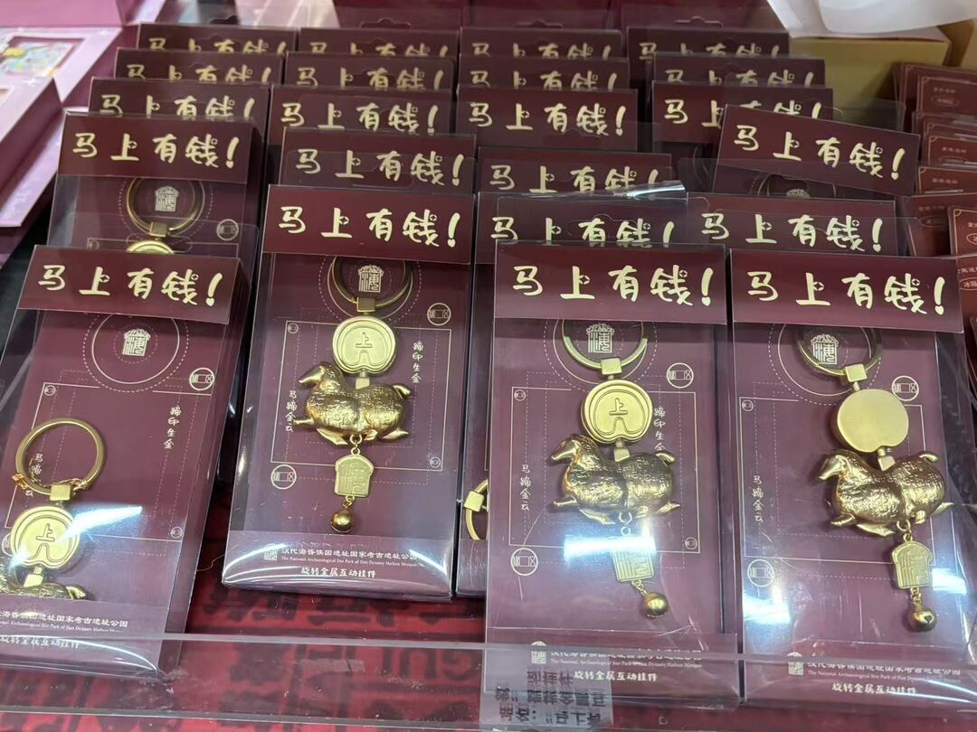 “今年是马年,我们也结合馆内文物重点推出了一系列马主题文创。”文创店工作人员介绍,最受欢迎的是“马蹄金流沙冰箱贴”,设计巧妙融入英文“money”(谐音“马内”)与“上”字,寓意“马上有钱”“马上发”。另一款“马上有钱旋转金属挂件”,则将肥马造型与马蹄金结合,成为年轻人追捧的“送礼新选”。