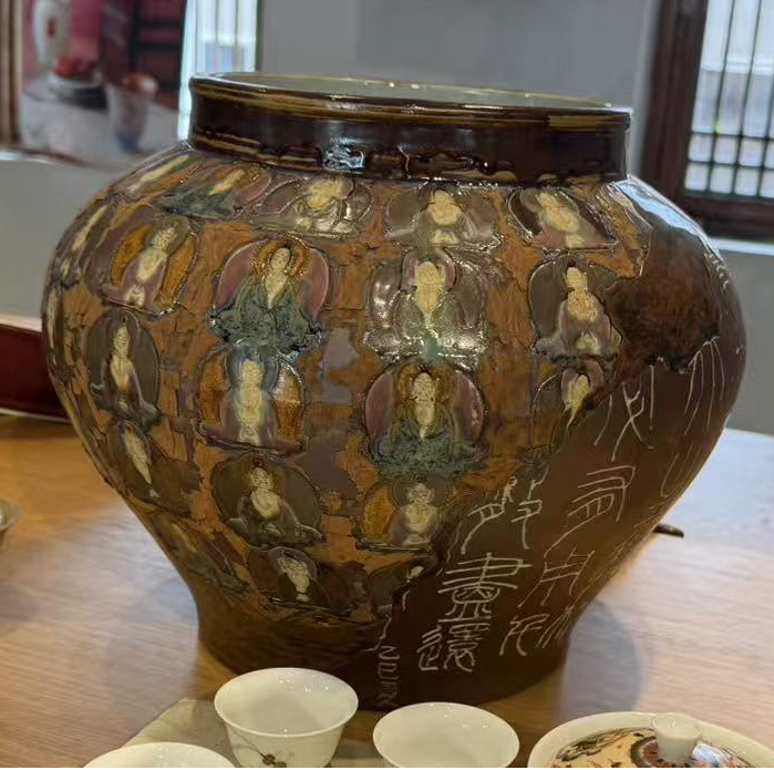 创作时,史良特意在罐面融入敦煌经书残卷的肌理。在他看来,那不是刻意的仿古,而是表达一声无声的叹息。“岁月无情,文物易朽。但窑火有情。高温颜色釉在1360℃中‘入窑一色,出窑万彩’,让千佛在釉色流淌间获得另一种永恒。这是守望,也是传承。”