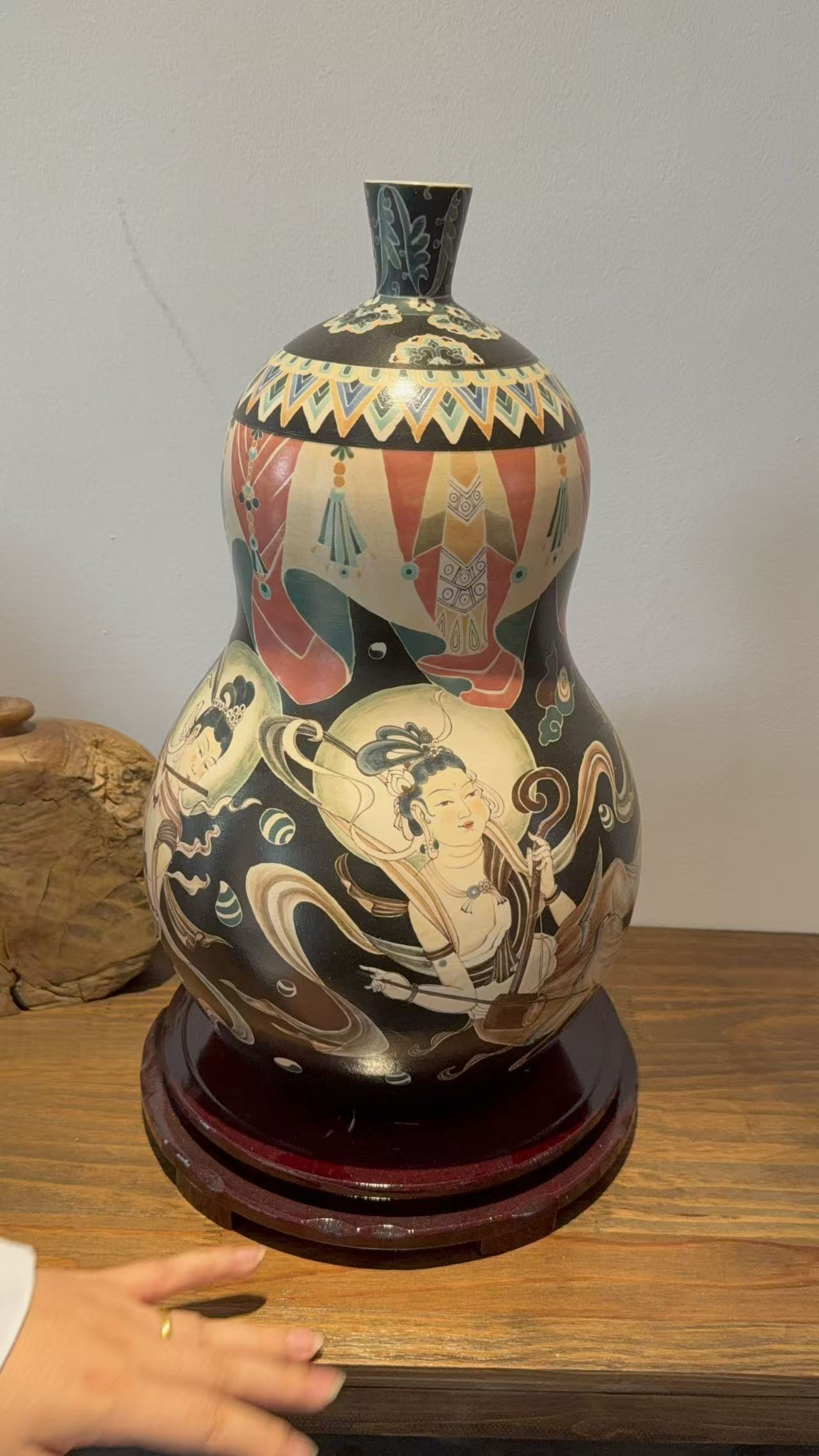 一旁的展柜里,魏荣荣的两件瓷瓶则是一派飞天的轻盈。一件《五彩伎乐葫芦瓶》,葫芦造型圆润饱满,上半部饰以如意莲花藻井纹,三组敦煌伎乐飞天翩跹于瓶腹,衣带随风,手中似有千年古乐将起。