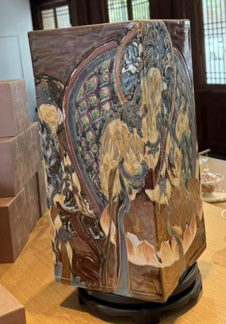 此外,史良还带来了一件工艺极具挑战的作品——《古法镶方·佛影说法尊》。史良表示,景德镇素有“一方抵十圆”之说,方形镶器从塑形到烧制都容不得半点偏差。他将敦煌说法图佛像绘于方器之上,颜色釉在高温中自然流淌交融,佛影庄严,釉色绚烂,传统匠艺与千年信仰在此合而为一。