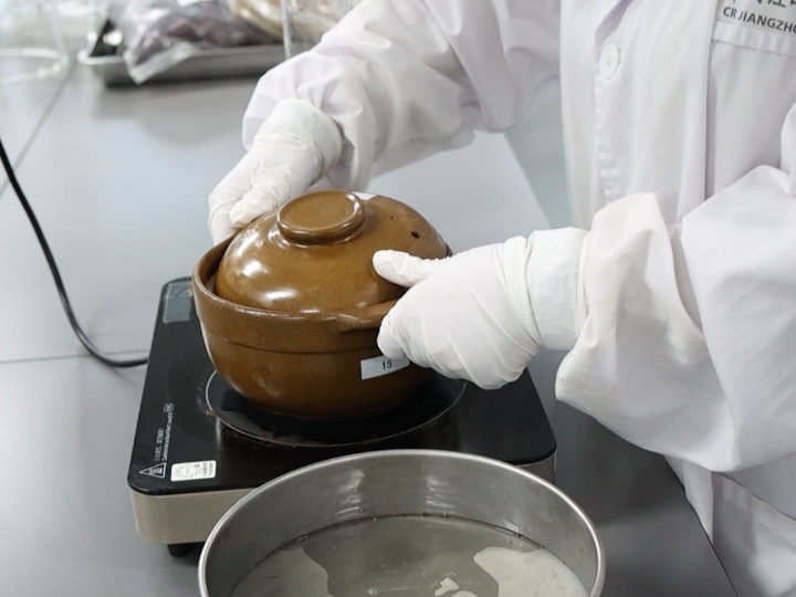走进华润江中研发大楼,实验室里一片静谧。研究人员身着洁净服、戴着口罩,正专注于手上的试验,忙碌而有序。在提取浓缩室,一个特别的“煎药”场景吸引了记者的注意。研究员熊丽丽正将几味中药放入砂锅,注入定量的饮用水后开始煎煮。随着水温升高,中药材特有的香味弥漫开来。
