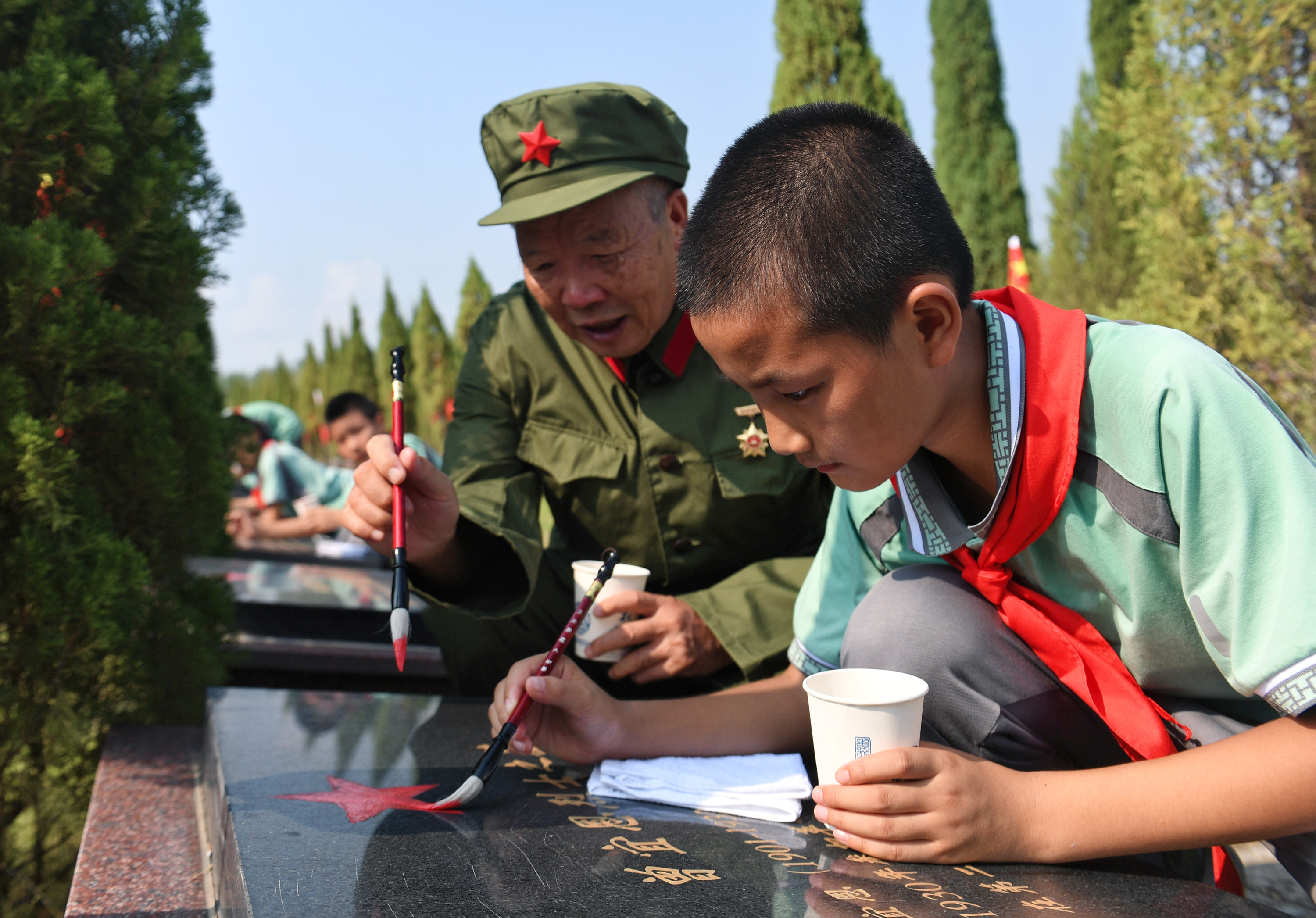 ▲江西于都组织老战士和少先队员开展烈士墓碑描红活动 摄影丨刘小强
