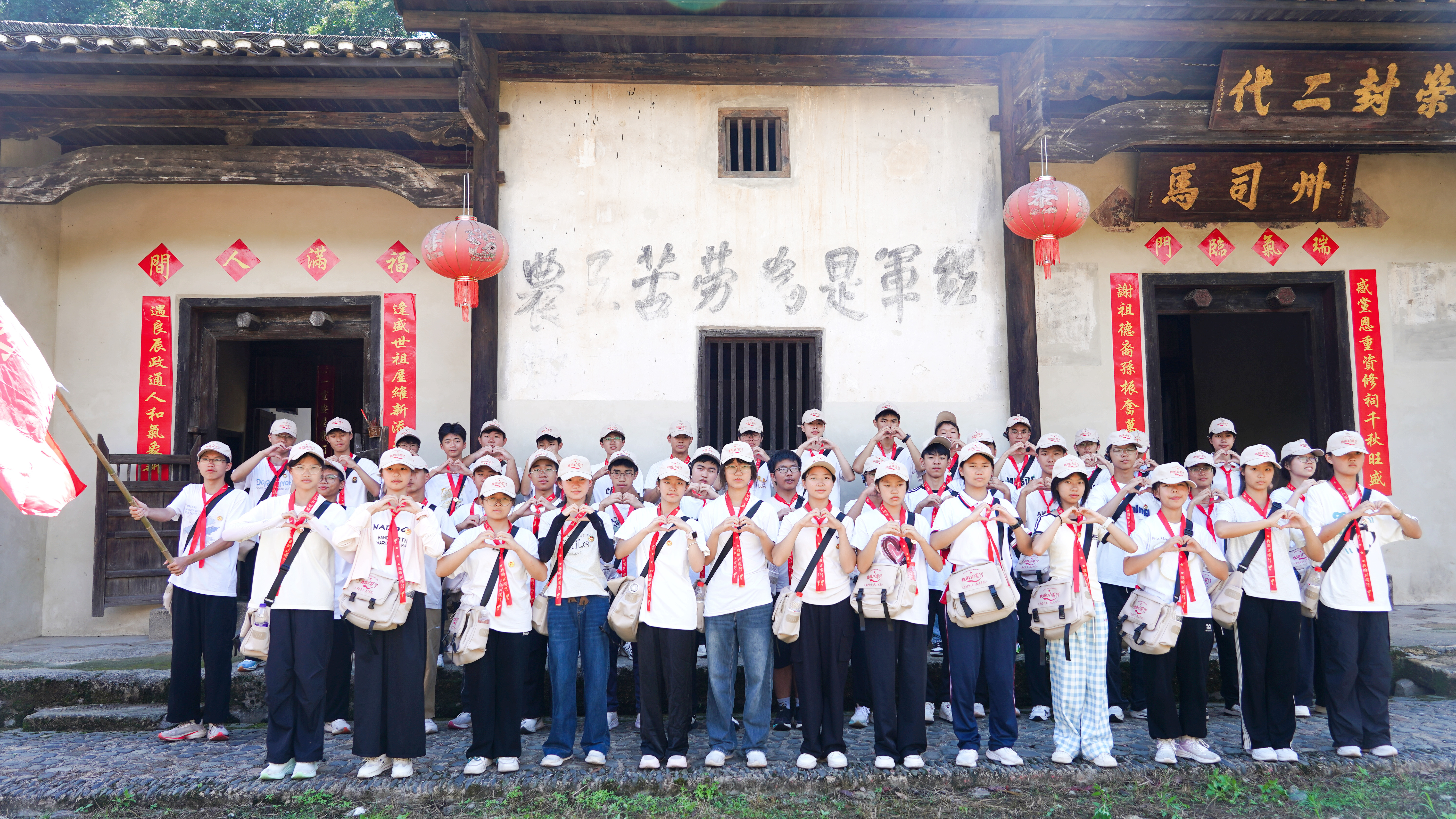 ▲“我的井冈行”研学人员在井冈山行洲村红军标语前集体“比心”。