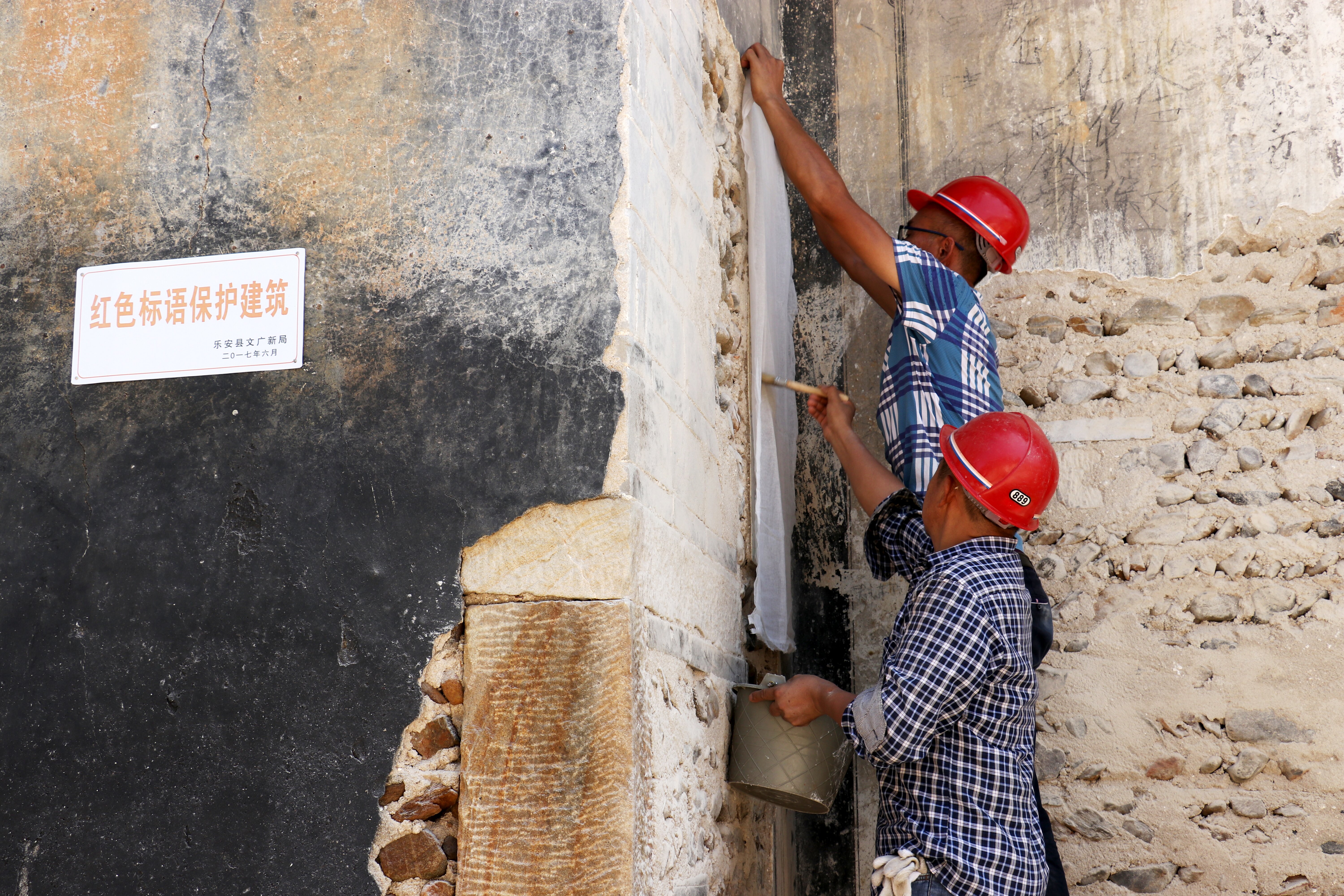 ▲去年8月,专业人员在乐安县揭取墙上的红色标语,为修复做准备。