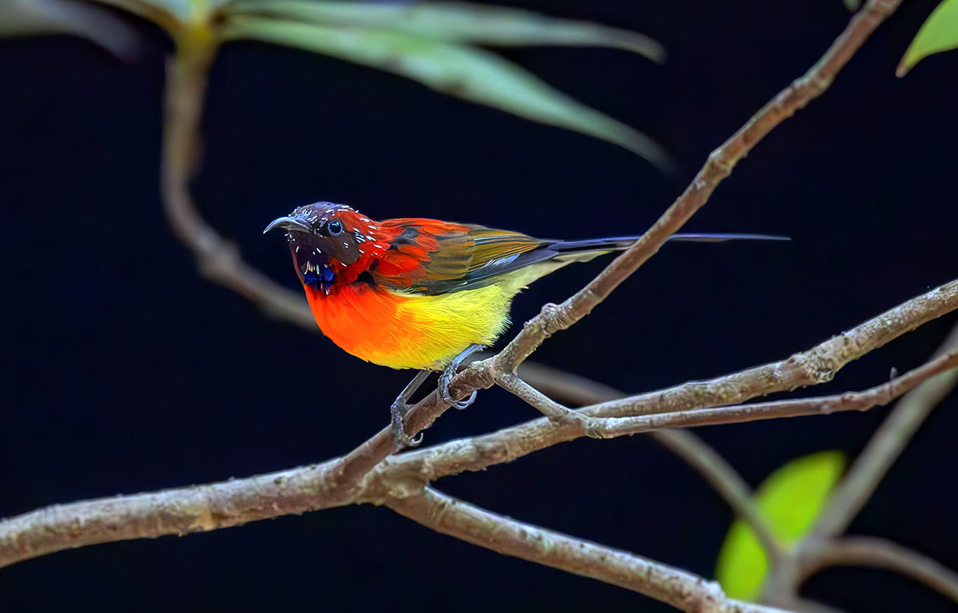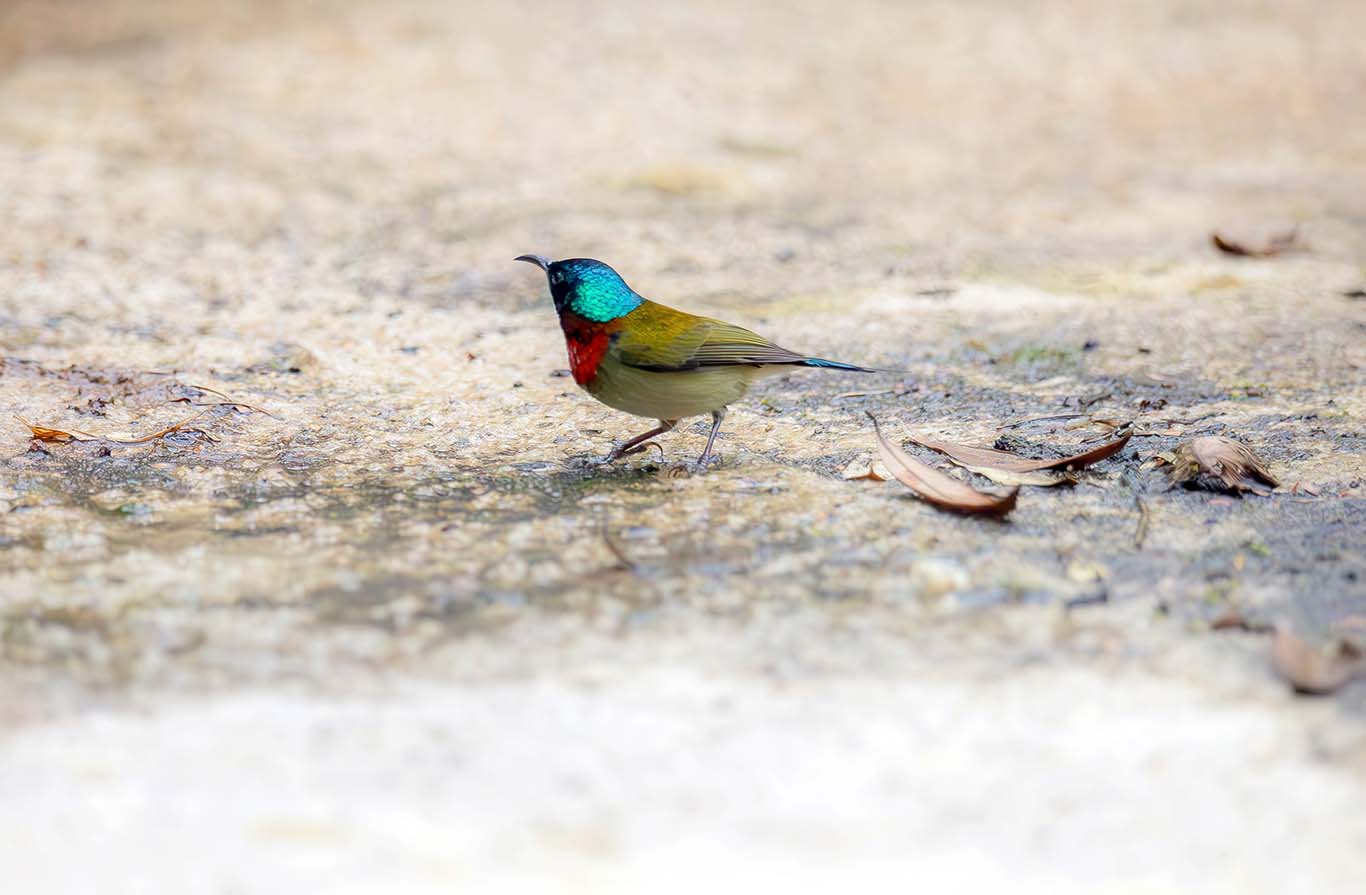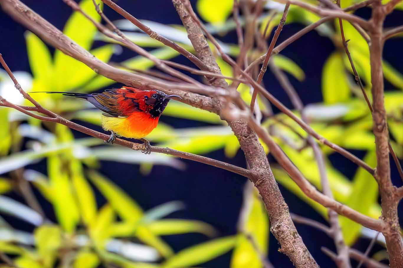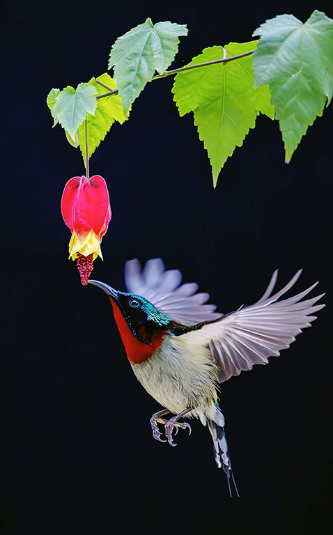 太阳鸟在花间灵动穿梭,翅膀高速振动,稳稳悬停在花苞下,细长弯喙探入花蕊吸食花蜜,动作轻盈如“空中芭蕾”