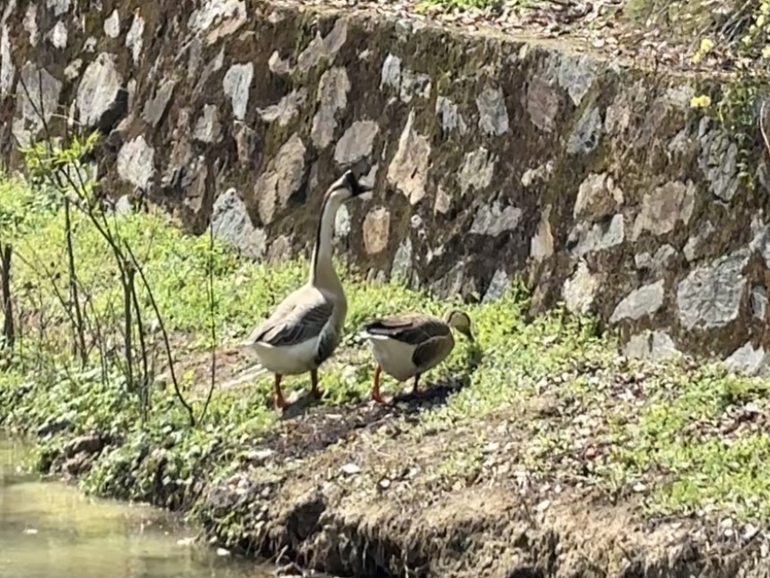 可还没来得及上岸,远处传来另一只母鹅的“嘎嘎”声,大鹅立刻竖起耳朵,犹豫了两秒,还是转身扑腾着朝母鹅游去。两只鹅很快并肩浮在水面上,画面温馨而宁静。