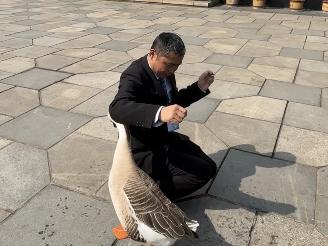 这只大鹅最近火了。一段它在八大山人纪念馆真迹馆门口与保安大叔“对话”的视频刷屏网络:大鹅试图入馆,张建军俯身劝阻:“你怎么来啦?快去找你老婆玩吧!”一人一鹅你一言我一语,仿佛在哄劝老朋友。网友被这只通人性的鹅圈粉,亲切地称它为“鹅鹅耷”。