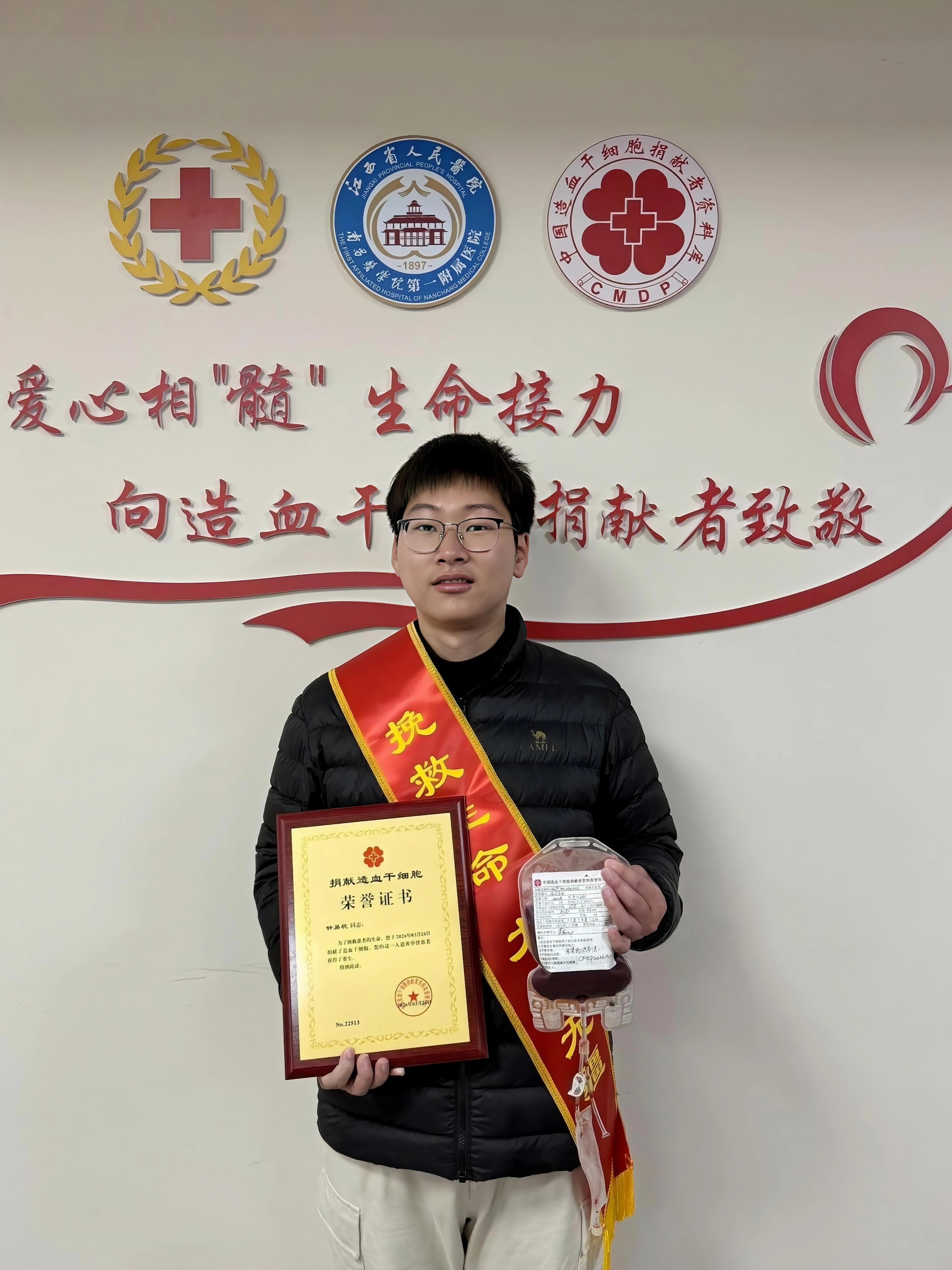 在老师和同学眼中,钟易杭的善举并非偶然。这名从瑞金走出、在赣鄱大地成长的青年,自本科阶段便踏上公益之路,五年间累计献血32次,总献血量达1.28万毫升,荣获全国无偿献血奉献奖银奖。“用可再生的血液,挽救不可重来的生命”,这是他坚守公益的初心。2023年,在深入了解中华骨髓库后,他毅然留取血样入库,将点滴热血化作延续生命的希望。