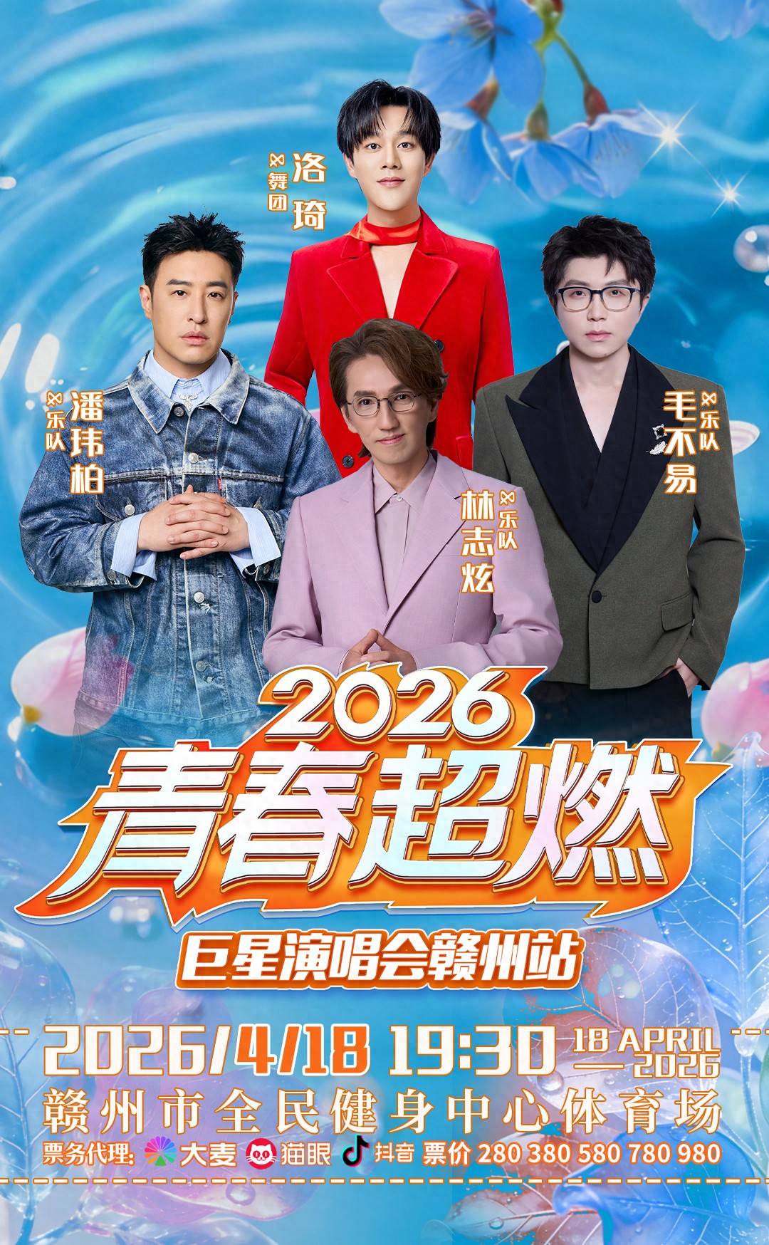 4月18日,江西赣州市将迎来一场前所未有的音乐狂欢!2026青春超燃巨星演唱会(赣州站) 将于当晚19:30在赣州市全民健身中心体育场火热开唱。毛不易、林志炫、潘玮柏、洛琦四位华语乐坛实力唱将强势集结,为赣州歌迷带来一场跨越青春的音乐盛宴。